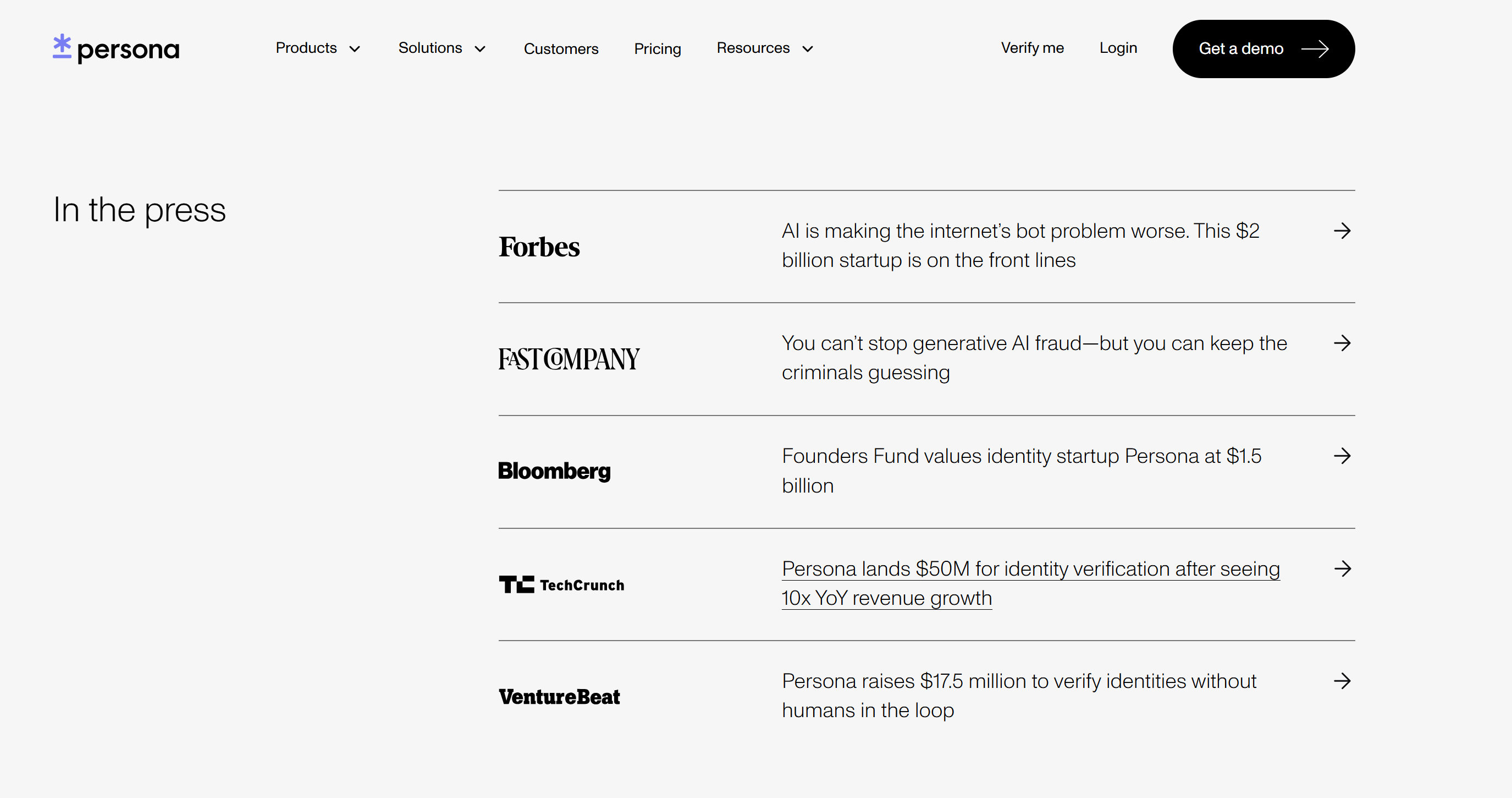 Persona Identities, a San Francisco Startup that helps companies with KYC/AML/KYB programs, fight fraud. The startup made sure to include their brand mission, values, press mentions, investors list, and G2 reviews on their About Us page.